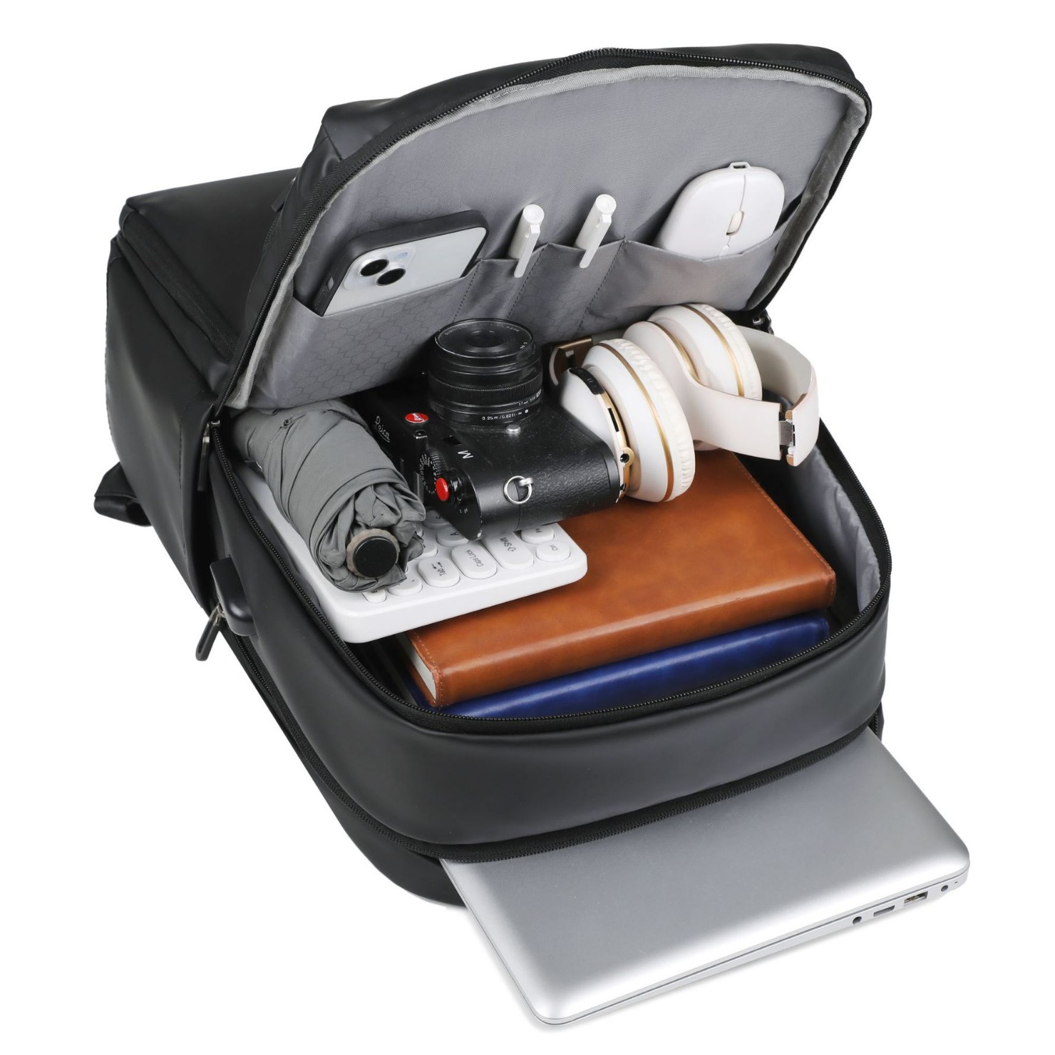 15.6インチまでのパソコンが収納可能な大容量リュックです。 ビジネスシーンに最適な洗練されたデザインで、通勤や出張に活躍します。 撥水加工を施した素材で雨の日も安心してお使いいただけます。 軽量設計で長時間の持ち運びも快適です。 携帯電話や充電器、書類などをすっきり整理できる多彩な収納ポケットを備え、機能性と実用性を兼ね備えた逸品です。