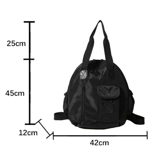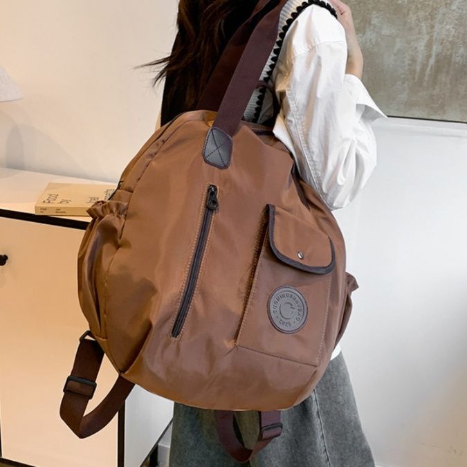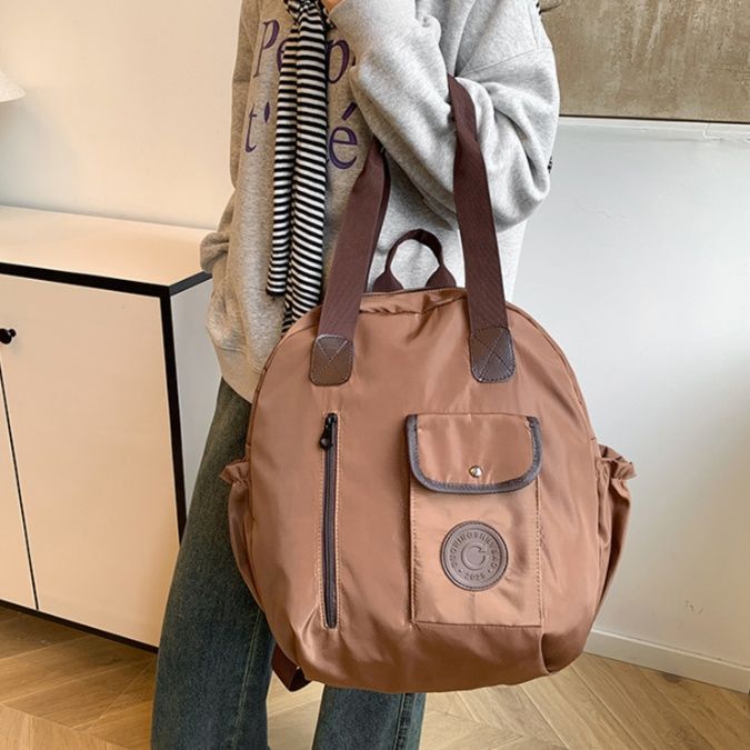 フロントには便利な外ポケット、背面と手提げの3通りの持ち方が可能で、肩紐は90cmまで調節できます。